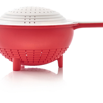 Deze multifunctionele, hittebestendige set van twee vergieten is stabiel, laat koude en warme voedingswaren efficiënt uitlekken en past op Tupperware-kommen van verschillende groottes! Het ondiepe deksel gebruik je om vocht uit sauspannen en blikken af te gieten, terwijl het diepere vergiet perfect is voor maximaal 0,5 kg pasta. Je kunt beide delen ook in elkaar haken om je groenten tot in de puntjes te spoelen.