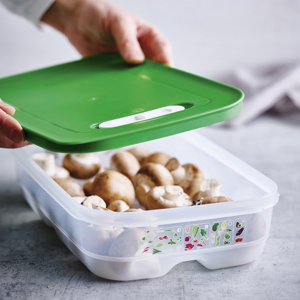Met onze slimme opbergdoos verspil je minder voedsel én bespaar je geld, want dankzij de gecertificeerde, innovatieve technologie blijven je fruit en groenten langer vers. Het doordachte verluchtingssysteem regelt de vocht-, zuurstof- en kooldioxidecirculatie om de versheidsduur van je fruit en groenten te verlengen, welk seizoen het ook is. Elke soort fruit of groente heeft andere omstandigheden nodig om optimaal te 'ademen'. Ons unieke ventilatiesysteem laat je de luchtcirculatie in de doos aanpassen met behulp van een schuifklepje, volgens het duidelijk zichtbare groente- en fruitdiagram dat op de zijkant van elke doos gedrukt staat.
