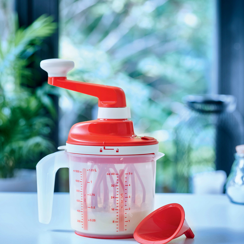 De basis heeft een handvat en tuit om je bereidingen na het kloppen makkelijk uit te schenken. De maataanduidingen komen goed van pas tijdens het bereiden van je recept en de antislipring onderaan houdt het product stabiel op het aanrecht tijdens het kloppen
