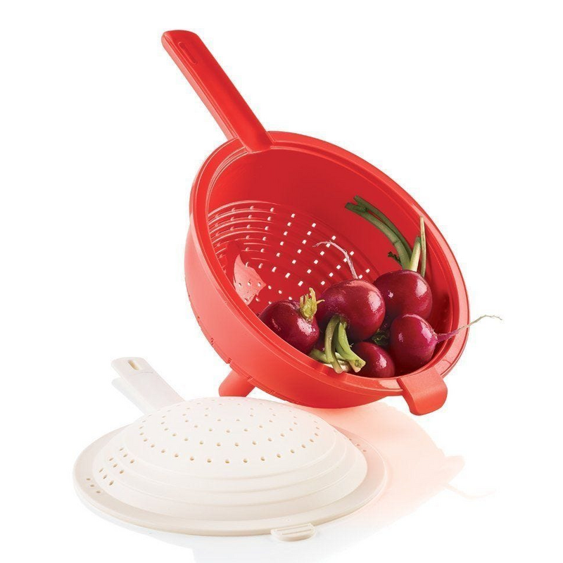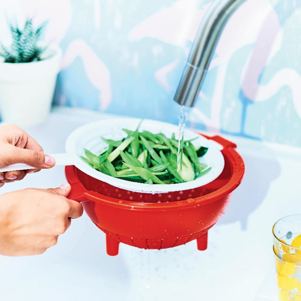 Deze multifunctionele, hittebestendige set van twee vergieten is stabiel, laat koude en warme voedingswaren efficiënt uitlekken en past op Tupperware-kommen van verschillende groottes! Het ondiepe deksel gebruik je om vocht uit sauspannen en blikken af te gieten, terwijl het diepere vergiet perfect is voor maximaal 0,5 kg pasta. Je kunt beide delen ook in elkaar haken om je groenten tot in de puntjes te spoelen.