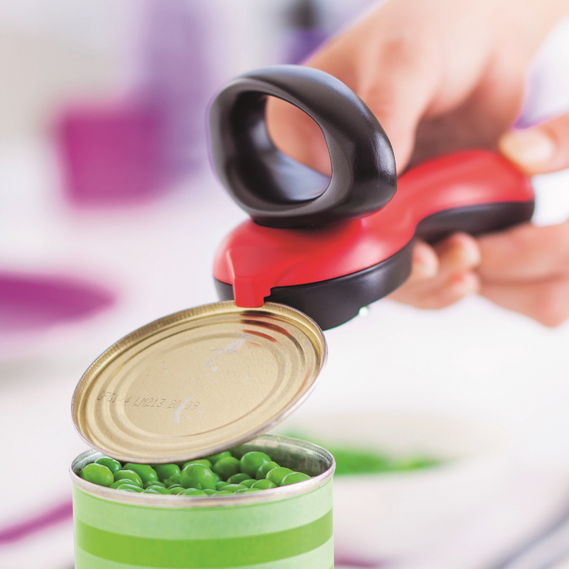 Zelfs de moeilijkste blikken zijn geen uitdaging voor deze gebruiksvriendelijke blikopener. Onze innovatieve handmatige blikopener tilt het deksel op, weg van de inhoud van het blik, en laat geen snijranden in contact komen met het voedsel. Bovendien zorgt deze blikopener ervoor dat er geen scherpe randen aan het blik of deksel zitten.