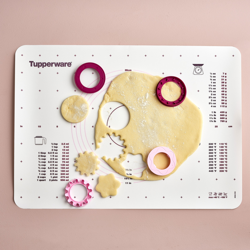 Het deegblad is bedrukt met de gangbare doorsneden van springvormen/bakplaten en omrekeningstabellen van internationale maateenheden: zo zie je deze belangrijke informatie steeds in een oogopslag.