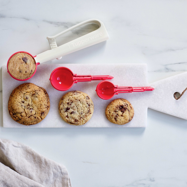 Met de Click & Scoop hoef je nooit meer te raden of je balletjes of koekjesdeeg groot genoeg zijn. Zo werk je heel wat sneller en efficiënter. Gebruik gewoon de Tupperware Click & Scoop en zet de oven alvast aan!