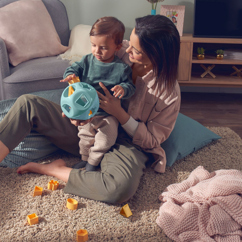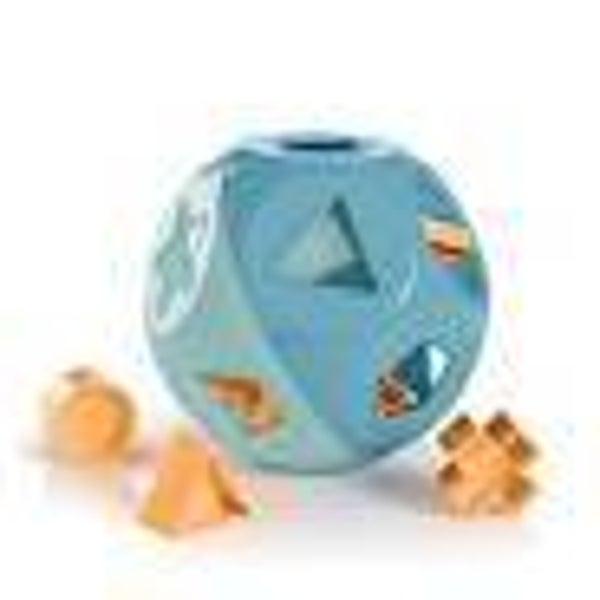 • Een bol met 10 openingen in de vorm van geometrische figuren met een handvat aan